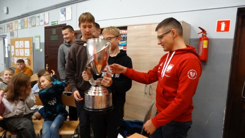 Zaproszony Mistrz opowiedział o sporcie jaki uprawia ( wyścigi szybkich łodzi), o swojej drodze do sukcesu, osiągnięciach oraz pokazał medale i przenośny puchar Mistrza Świata, który aktualnie należy do naszego Gościa.