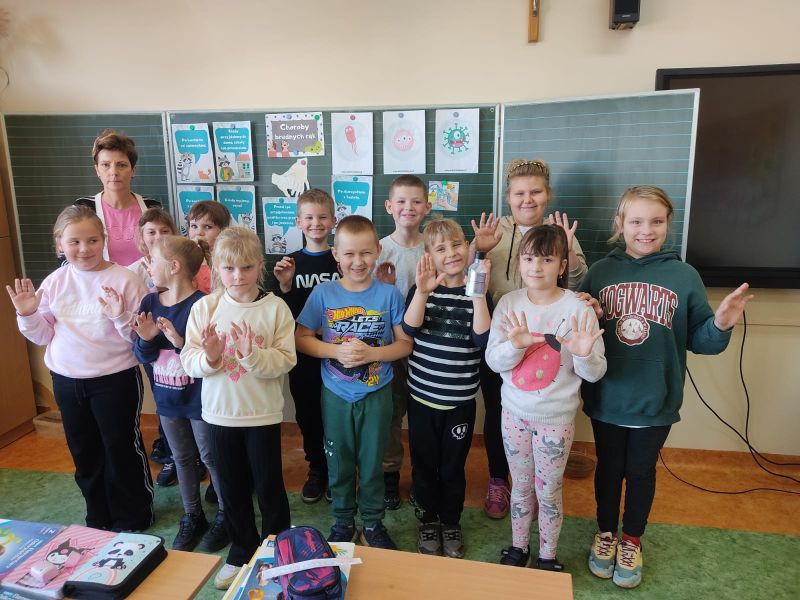 15 października, na całym świecie obchodzony jest Światowy Dzień Mycia Rąk. Do akcji włączyli się również uczniowie klasy drugiej naszej szkoły. W trakcie zajęć, przeprowadzonych przez pielęgniarkę panią Sylwię Kowalewską, dzieci zdobyły wiedzę na temat bakterii bytujących na brudnych dłoniach oraz chorób przenoszonych za ich pośrednictwem. Uczniowie zapoznali się z techniką mycia rąk, w teorii i w praktyce. Poprzez rozmowę naprowadzającą, przypomnieli sobie, w jakich sytuacjach powinni szczególnie dbać o czystość. Wszystkie przekazane informacje opatrzone były plakatami i doświadczeniami.